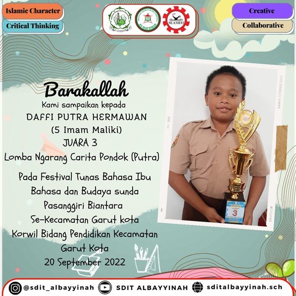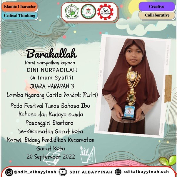 - Juara Harapan 3 Lomba Baca Puisi Tingkat SD pada Kegiatan Lomba Literasi Gerakan Indonesia Membaca (GIM). Pada tanggal 29 September s.d 22 Oktober 2021 yang Diselenggarakan oleh Dinas Pendidikan Kabupaten Garut.
